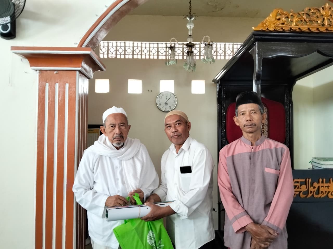 Penyerahan wakaf sarung oleh Ketua Tanfidziyah MWCNU Kaliwates, Ustad Sunarto, kepada pengurus Masjid Nurus Sholihin Kepatihan sebagai bagian dari program berbagi untuk mendukung kenyamanan jamaah dalam beribadah. Foto (Najibullah/Kaliwates)