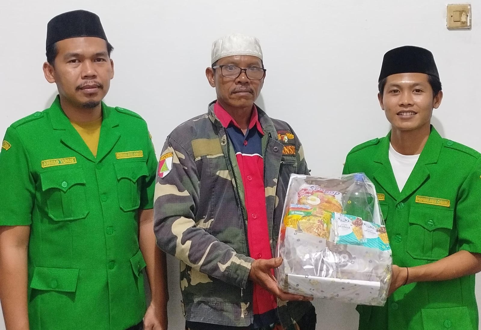 Ketua PAC GP Ansor Mayang, Syukron Ma’mun, menyerahkan tali asih berupa baju Ansor dan bingkisan Lebaran kepada kader Banser sebagai apresiasi atas loyalitas mereka. (Dok Foto/Ansor Mayang).