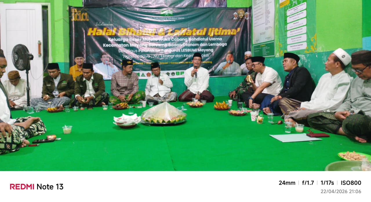 Mayang, pcnujember.or.id – Keluarga besar Nahdlatul Ulama melalui Majelis Wakil Cabang (MWCNU) Mayang menggelar Halal Bihalal dan Lailatul Ijtima’ bersama pengurus ranting se-Kecamatan Mayang, lembaga, serta badan otonom (banom), Selasa (22/4/2026). Kegiatan yang berlangsung di Kantor MWCNU Mayang ini juga dirangkai dengan pelantikan pengurus Lembaga Seni Budaya Muslimin Indonesia (LESBUMI) masa khidmat 2026–2029.